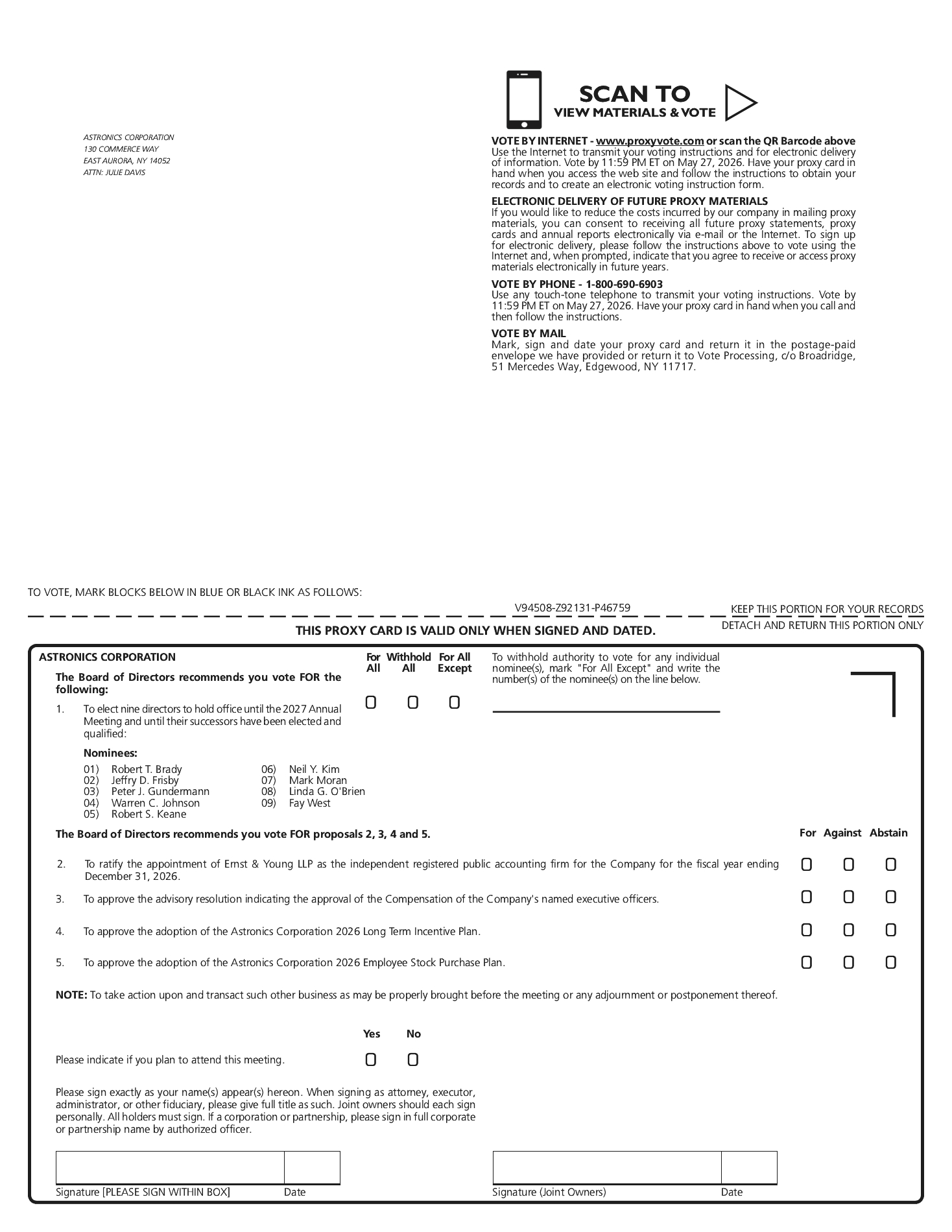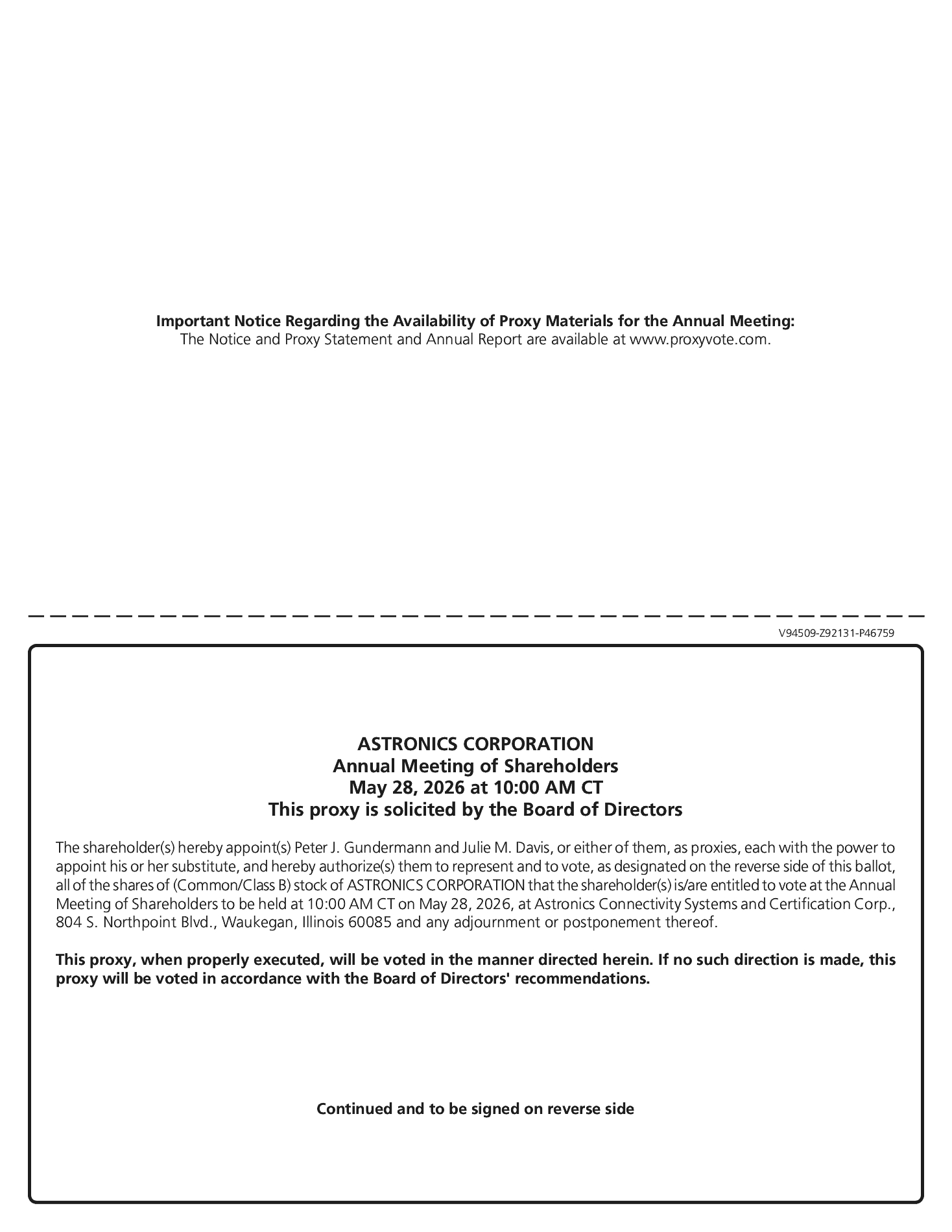 I look forward to you joining us at the 2026 Astronics Corporation Annual Meeting of Shareholders which will be held in person at 10:00 a.m., Central Time, on Thursday, May 28, 2026, at Astronics Connectivity Systems & Certification Corp. at 804 S. Northpoint Blvd., Waukegan, Illinois 60085 USA. The attached Notice of 2026 Annual Meeting of Shareholders and Proxy Statement discuss the items scheduled to be voted on by shareholders at the Annual Meeting. | |||